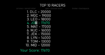 RACER 101 is a pseudo 3D arcade style racing game. Players can do a full lap and keep looping laps. A Top 10 Racers screen appears after each race to enter your initials. ⛽🚗